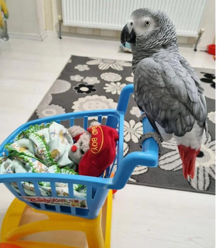 Whether he imitates voices, sounds and household noises, learns commands and tricks, does problem-solving exercises, learns new words, solves puzzles or simply enjoys your company – our grey parrot provides endless entertainment and affection in your home.